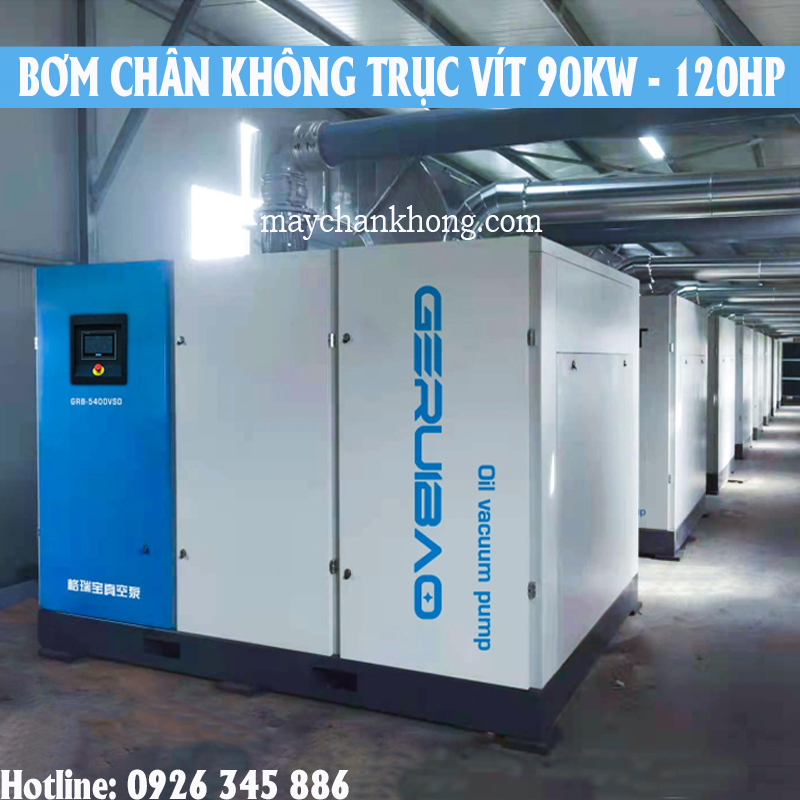 Bơm chân không Geruibao GRB-5400VSD, công suất 90kw - 120HP là dòng bơm chân không trục vít, tích hợp công nghệ biến tần, bôi trơn bằng dầu, có hiệu suất tiết kiệm năng lượng cao, công nghệ biến tần giúp tiết kiệm điện năng lượng lên đến 35%. Có thể tự động điều chỉnh lưu lượng theo nhu cầu, sử dụng bộ phận chính trục vít chân không tiên tiến và động cơ nam châm vĩnh cửu hiệu suất cao để hỗ trợ sản xuất.