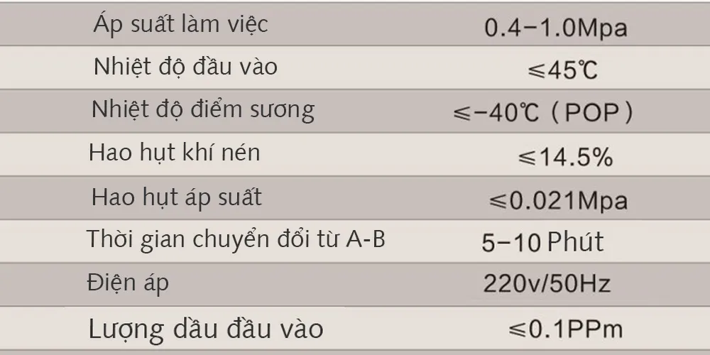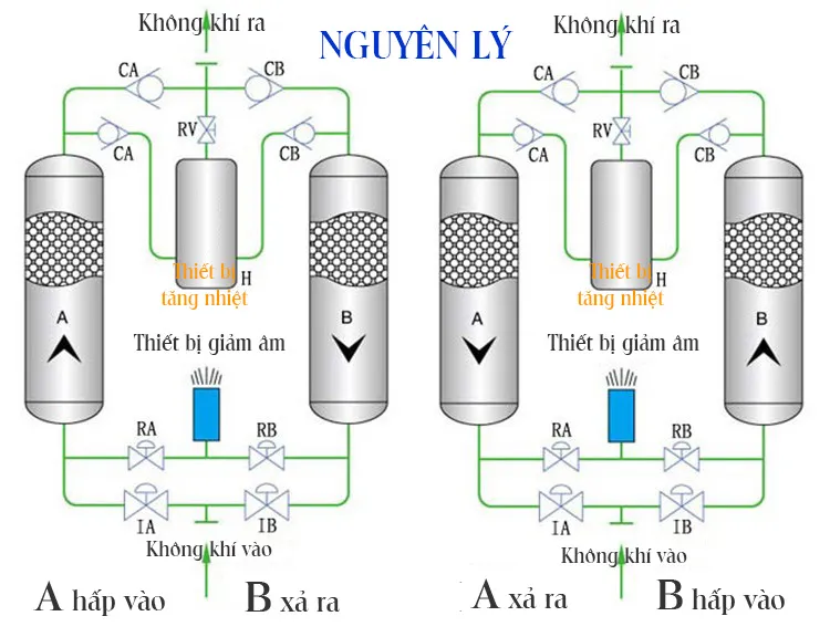 • Tháp A và tháp B của máy sấy hấp thụ không gia nhiệt chuyển đổi mỗi 6 phút một lần.